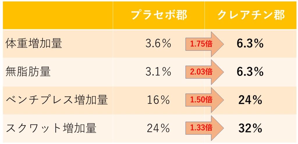 クレアチン補給郡20%:プラセボ郡12% と8%大きかった。