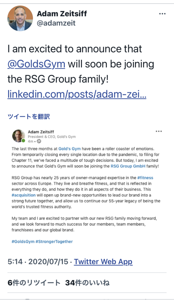 7月15日、当時の米ゴールドジムCEOであったAdamZeitsiff氏が自身のtwitterでも発表しております。